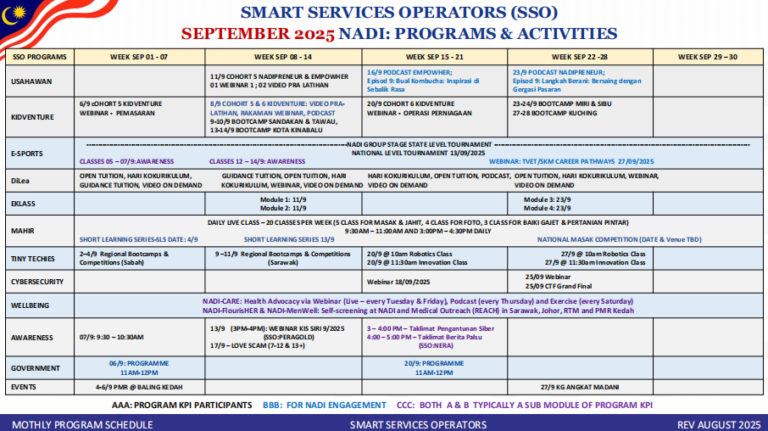 4 July 2025 TARIKH / HARI PROGRAM ISNIN E-SERVICES / KEUSAHAWANAN / KESEJAHTERAAN KENDIRI / CYBERSECURITY SELASA E-SERVICES / KEUSAHAWANAN / MAHIR RABU E-SERVICES / KELAS ICT / KESEJAHTERAAN KENDIRI / MAHIR KHAMIS DAN JUMAAT E-SERVICES / MAHIR / CYBERSECURITY / […]